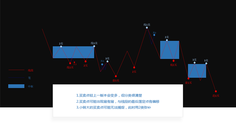 新版本算法与显示,区分出买卖点的类型,新算法的买卖点精细度与对称性更强了。