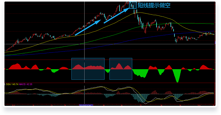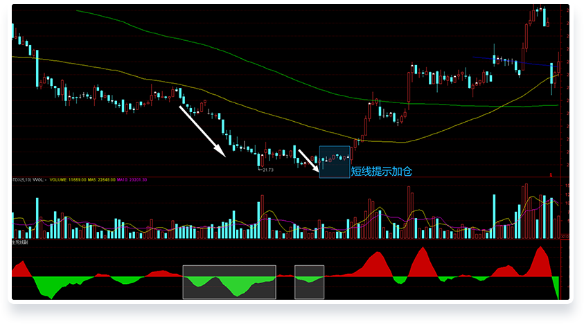 如右图,空头的两次空间和力度比较,明显是空的空间和下面的能量不足。此时空头出现衰竭,阶段性底点出现,短线提示加仓