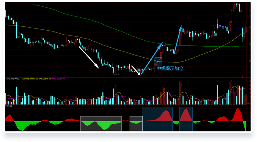 如右图,明显是空头小于多头的空间和力度,多头力量突破生死线,中线提示加仓