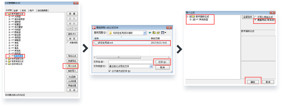 选中 “技术指标公式-其他类型-导入公式” ,导入文件 “多空生死线.tn6”